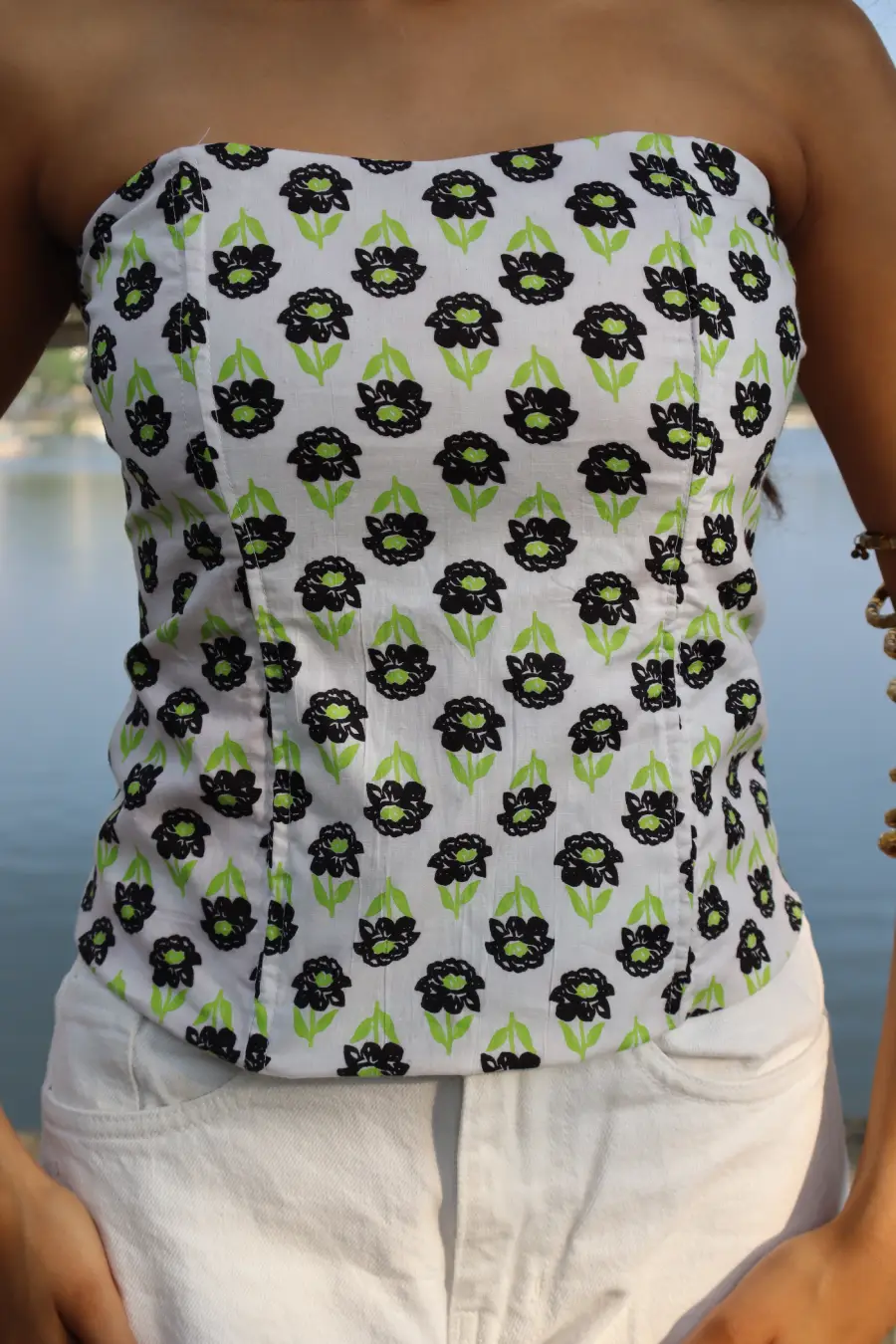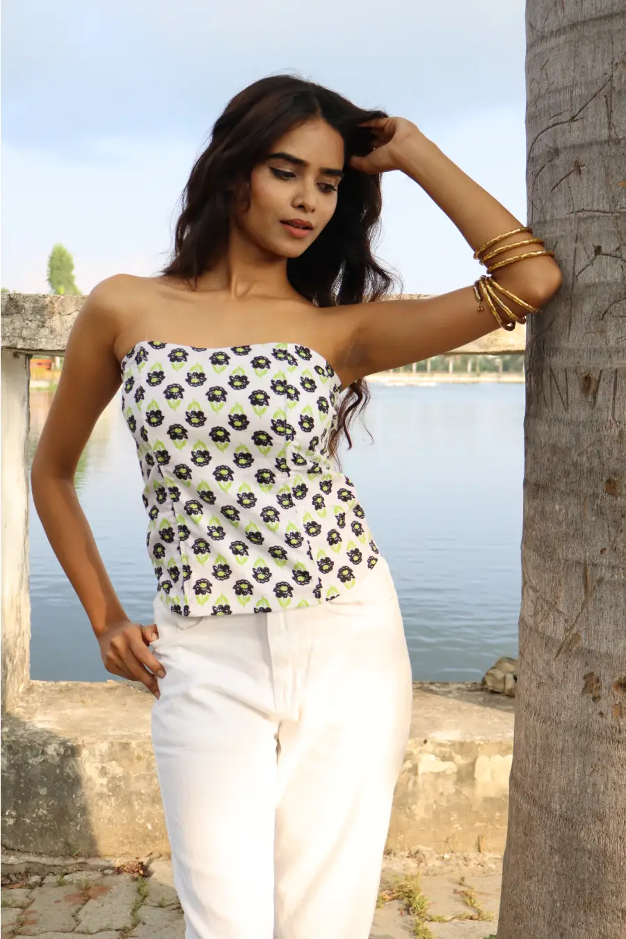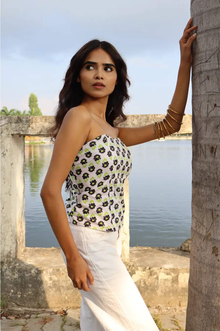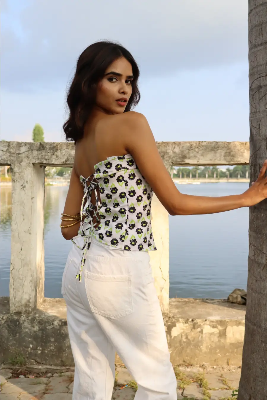 Designed with a flattering corset-style silhouette, this top combines classic charm with modern minimalism. The crisp white finish makes it a versatile wardrobe essential, perfect for pairing with denims, skirts, or layered under jackets.